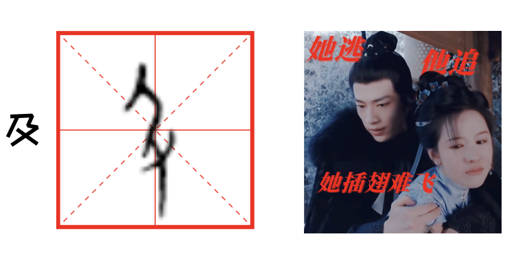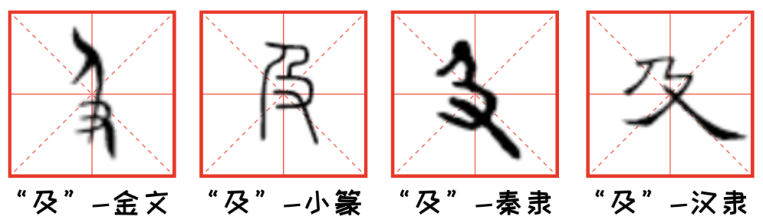 今天咱们在写“及”字时,将横折折撇行为一笔写完,但聚会其字形演变经由会发现,这一笔其实包含两个不同的部分。从甲骨文到隶书,“及”字上头的“东说念主”手部伸长,造成一撇,腿部上抬,和体魄一皆组成半个横折折撇;底下的“手”基本保持原貌,抨击的手指变成另一半横折折撇,手臂和其他手指变为一捺。