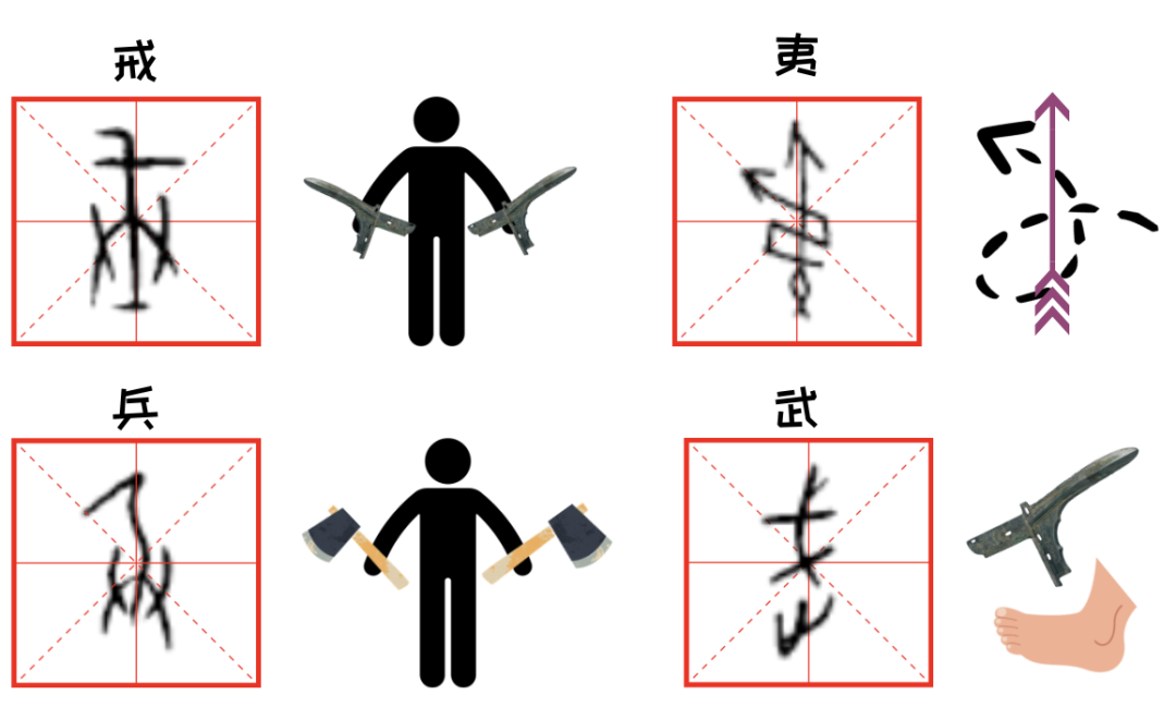 值得正式的是,从“武”字的甲骨翰墨形来看,将“武”字讲明为“止戈为武”是有失偏颇的。行走的东说念主举着戈,代表士兵举着火器行军,这才是“武”字的本义。