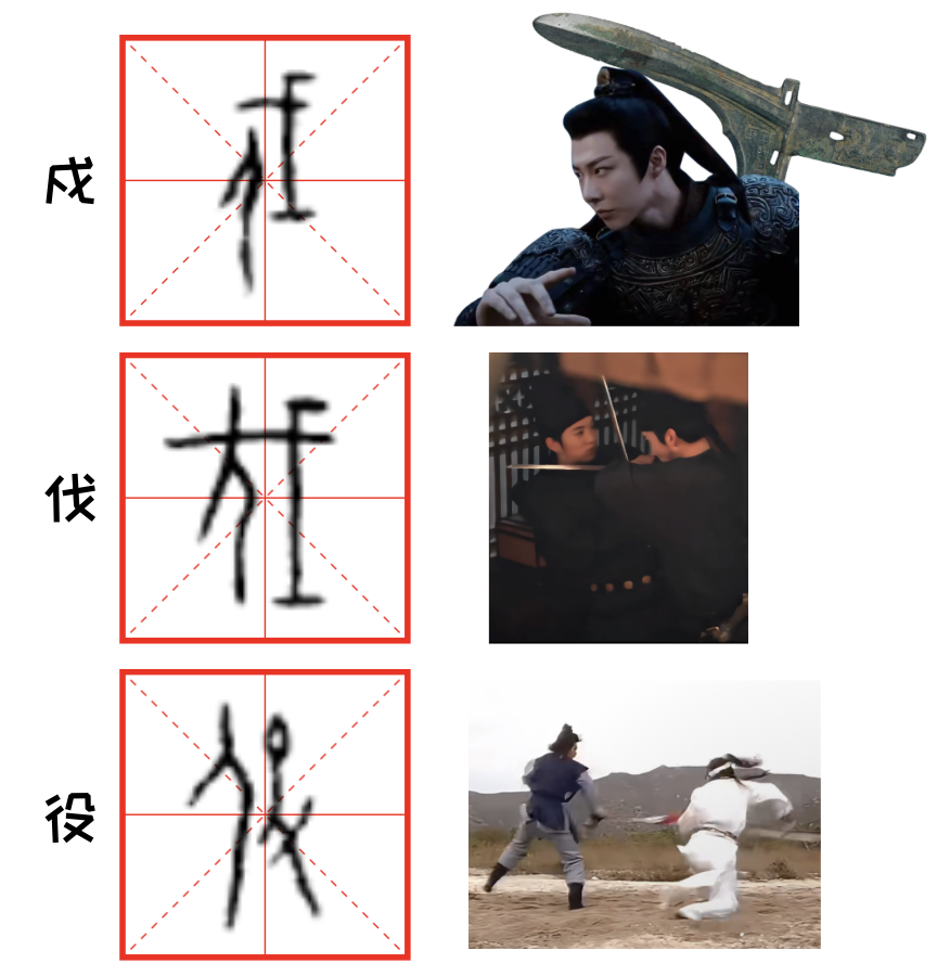 两“东说念主”相“鬥”时是肉搏,要是给“东说念主”一把“戈”或“斤”(一般指斧头),就能组成“械斗雄兵”:一个东说念主扛着戈,这是“戍”;将东说念主的位置上移,就变成了用戈砍去东说念主头,这是“伐”;一只手拿火器驱遣散在前边的东说念主,这是“伇”,自后逐步演变为“役”字。