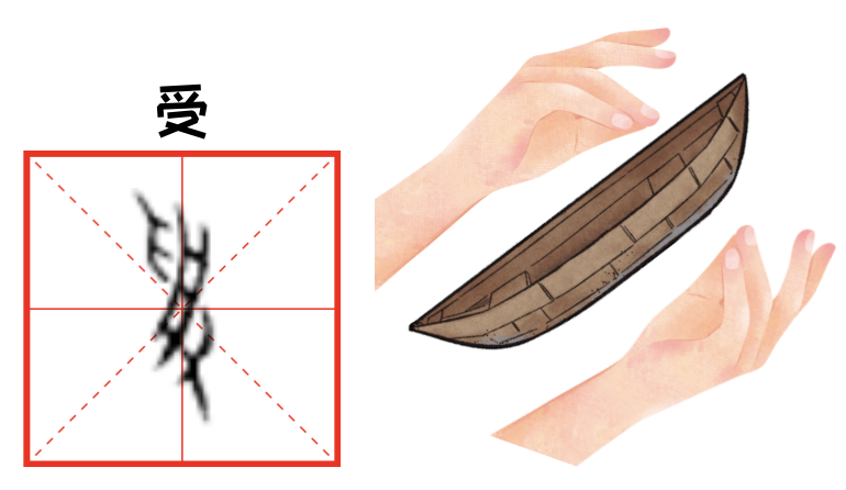 “受”字的甲骨翰墨形分为三部分,高下两只手,上端的辖下垂,下端的手托举,中间夹着一只“舟”——这就是“受”字的声旁。一只手将“舟”委用给另一只手,就组成了《说文解字》中讲明的“相付”之意。