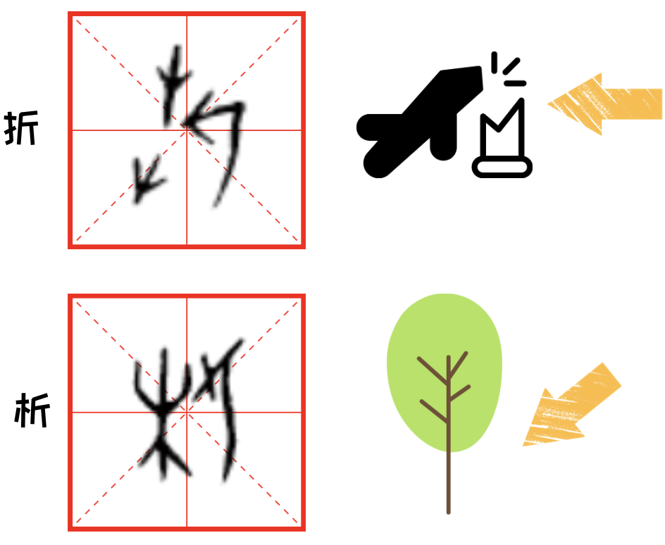 甲骨文中的“表情标志”不啻“不悦”,还有“单箭头”。先画两棵树:一棵是断的,一棵是完整的。在断树的断裂处画一个水平箭头,这就是“折”字。然后在完整的树阁下画一个指向向下的箭头这就是“析”字。